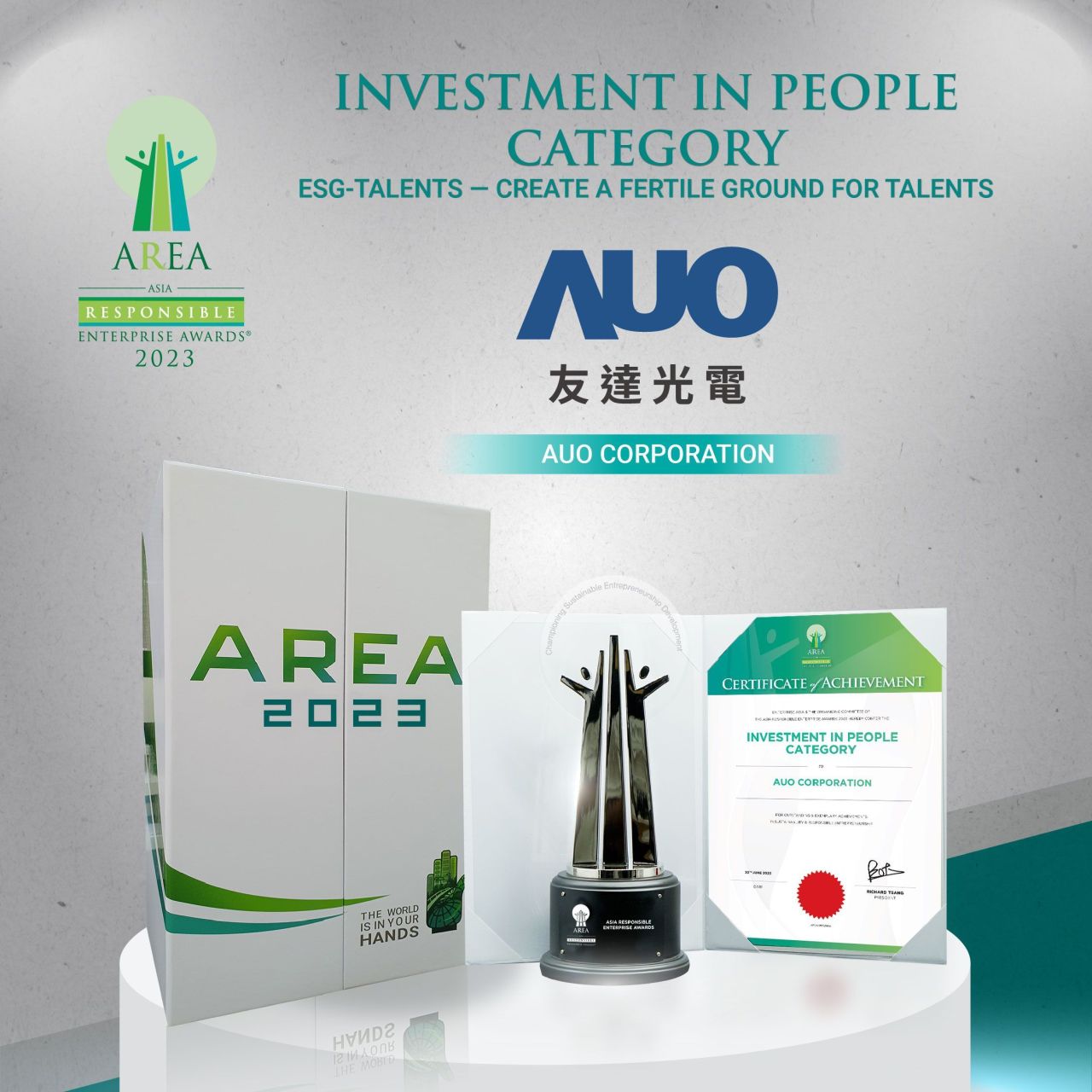 AUO, a global leading provider of display solutions, has received the 2023 Asia Responsible Enterprise Awards (AREA) in recognition of its exemplary efforts in the category of Investment in People. Among 260 companies and 378 submissions from 19 countries across Asia, AUO's commitment to fostering a thriving and empowered workforce stood out, earning the company this esteemed award.