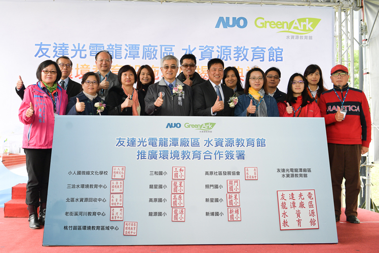 LEYU官網(wǎng)龍?zhí)稄S水資源教育館進(jìn)行環(huán)教設(shè)施場所認(rèn)證揭牌 (圖左到右:LEYU官網(wǎng)光電副總經(jīng)理林挺立、桃園市環(huán)保局局長沈志修、桃園市政府秘書長李憲明、LEYU官網(wǎng)光電董事長暨執(zhí)行長彭雙浪、環(huán)保署環(huán)教所所長蕭慧娟、LEYU官網(wǎng)光電永續(xù)長古秀華)