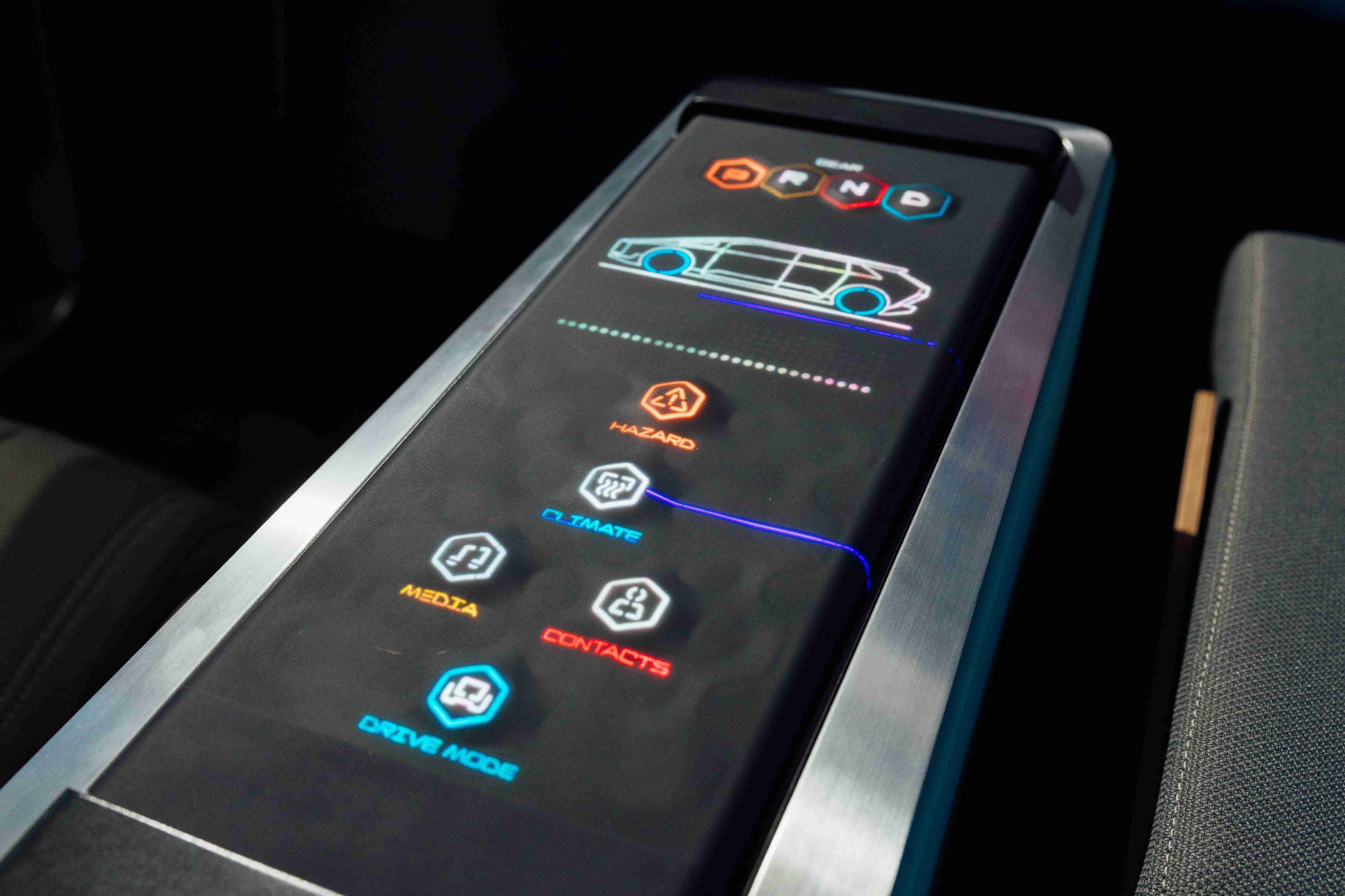 多變形態中控顯示(Morphing Center Control)擁有動態變化的表面,平時常態顯示車輛功能,進一步操作時,則會隆起成為3D 按鈕,并在觸控時以震動回饋,以精細的操作開創人機互動新境界。