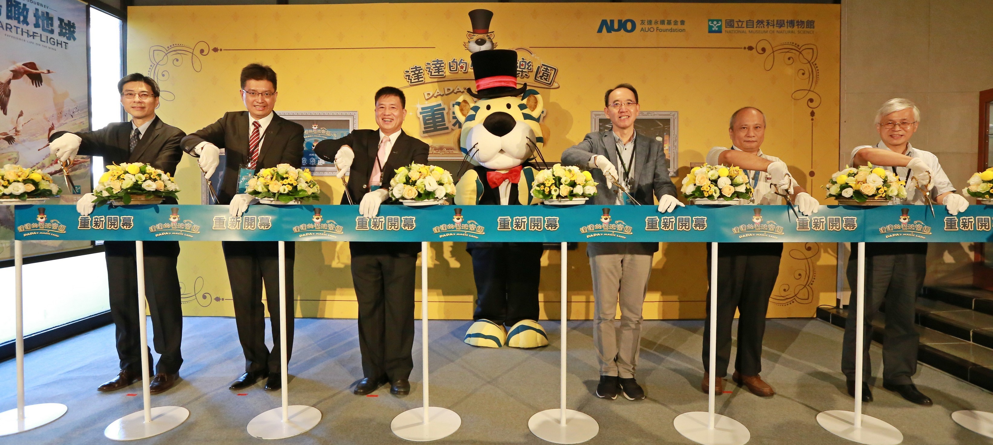 友達永續基金會董事長彭雙浪 (左三) 以及科博館館長焦傳金 (左四) 共同舉行達達的魔法樂園重新開幕儀式